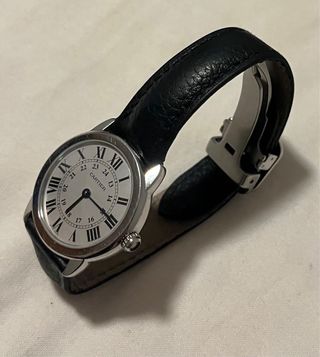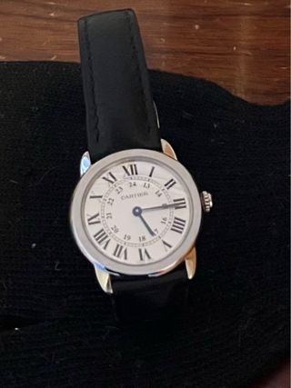 Elegante reloj Cartier Ronde Must De Cartier con correa de cuero negra y detalles plateados. - Esfera blanca con números romanos. - Correa de cuero negra. - Caja y detalles en tono plateado. KD6WX38 Quarzo 29 mm. Con documentación original en buen estado casi sin uso Precio original 5800€