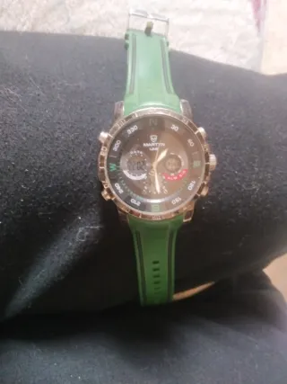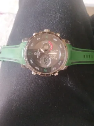 Reloj de pulsera con diseño deportivo y moderno. - Correa de silicona verde. - Caja de metal en tono negro. - Esfera con detalles de brújula y cronógrafo. Escucho ofertas