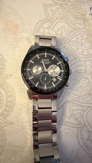 Reloj de pulsera con diseño deportivo y elegante. - Esfera negra con detalles plateados. - Correa de eslabones plateada. - Bisel giratorio negro.