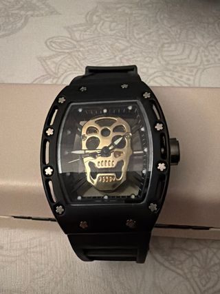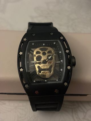 Reloj con un llamativo diseño de calavera. - Esfera con detalles dorados. - Correa negra. - Estilo moderno y audaz.