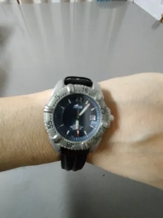 Reloj de hombre con esfera azul y detalles plateados. - Correa negra. - Bisel con marcadores. - Resistente al agua.