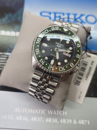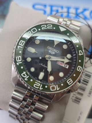 Reloj Seiko 5 Sports 100% original, modificado con bisel ceramico GMT en verde y esfera en negro, conocido popularmente como Starbucks. Cristal doble domed Zafiro. Armix original Seiko modelo Jubilee, también se entrega con correa diver original Seiko. Atención todo original SEIKO y cuidados que hay muchos por ahí montados con piezas y maquinarias chinas...