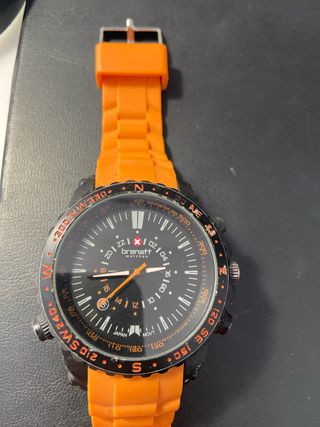 Reloj con correa de silicona naranja y detalles en negro. - Esfera negra con marcadores de hora y brújula. - Bisel con indicaciones de dirección y taquímetro. - Correa de silicona naranja. - Cierre de hebilla.