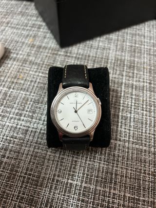 Elegante reloj Sido Sanström con correa de cuero negra. - Esfera blanca con detalles plateados. - Indicador de fecha. - Mecanismo automático. Reloj Sandström Automático – Fabricado en Suecia Se vende elegante reloj Sandström automático, una marca sueca reconocida por su diseño clásico y calidad relojera. 🔹 Marca: Sandström 🔹 Movimiento: Automático 🔹 Fabricación: Made in Sweden 🔹 Estado: Muy buen estado general, funciona correctamente 🔹 Correa: Cuero (con señales normales de uso) 🔹 Diámetro: Estilo clásico y cómodo para uso diario 🔹 Extras: No incluye caja ni papeles