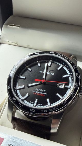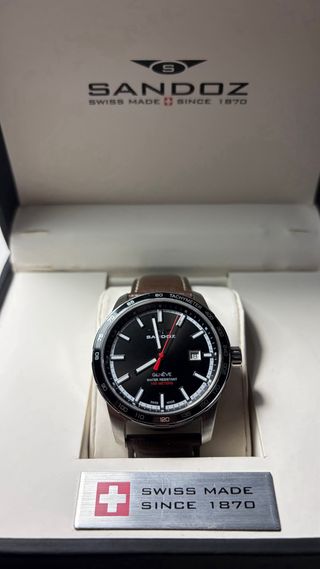 Reloj Sandoz Genève con cronógrafo y correa de cuero. - Bisel con taquímetro. - Resistencia al agua de 100 metros. - Indicador de fecha. - Esfera negra. - Correa de cuero marrón. - Algunas marcas de uso en la caja y en la correa, en el reloj no se ve nada a simple vista.