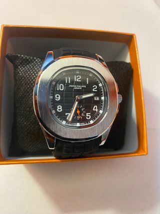 Elegante reloj Patek Philippe con correa de caucho negra. - Esfera negra con detalles plateados. - Bisel de acero inoxidable. - Correa de caucho flexible.