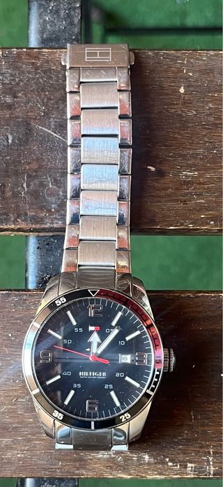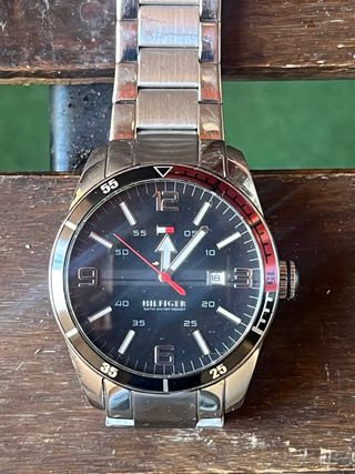 Reloj de pulsera Tommy Hilfiger con un diseño moderno y elegante. - Correa de eslabones plateados. - Esfera negra con detalles en rojo. - Cierre de seguridad.