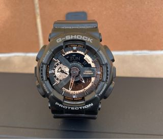 Reloj Casio G-Shock modelo GA-110RG con detalles en dorado. - Esfera analógica y digital. - Correa de resina negra. - Resistente a golpes y al agua (WR20BAR).