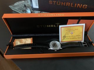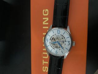 Elegante reloj Stuhrling con diseño skeleton. - Movimiento automático. - Correa de piel negra. - Caja de acero plateado.