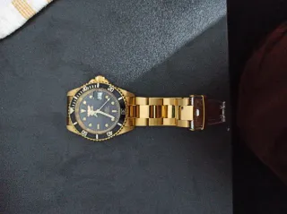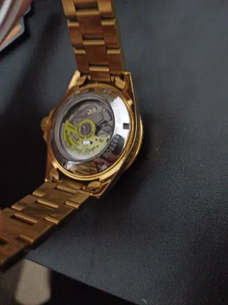 Elegante reloj Invicta con detalles dorados y bisel negro. - Diseño deportivo y sofisticado. - Correa metálica dorada. - Esfera oscura con marcadores visibles.