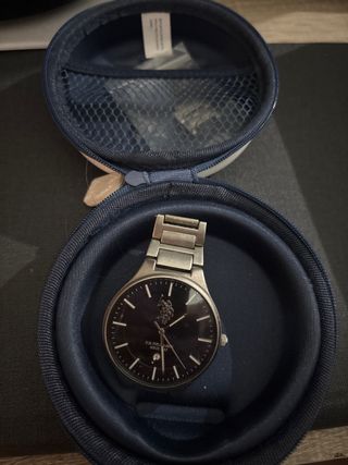 Reloj de la marca Calgary con correa negra y detalles plateados. La correa presenta algunos desperfectos. - Diseño moderno y llamativo. - Esfera clara con marcadores de hora distintivos. - Bisel plateado con detalles en negro.