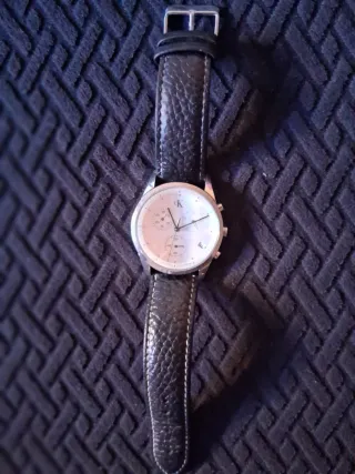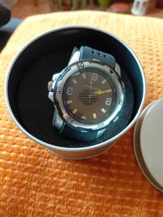 Reloj de correa de goma negra y esfera de acero, detalle de la marca en la correa. En perfecto estado. No tiene rebaja