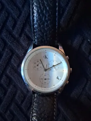 Elegante reloj Calvin Klein con diseño cronógrafo. - Esfera plateada con detalles en negro. - Correa de piel negra. - Resistente al agua.