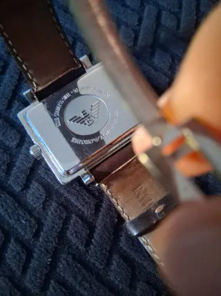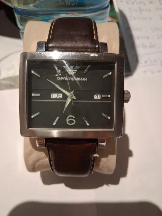 Elegante reloj Emporio Armani con diseño cuadrado. - Correa de piel marrón. - Esfera negra. - Detalles plateados.