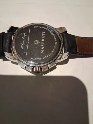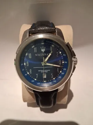 Elegante reloj Maserati para hombre con una esfera azul vibrante y detalles plateados. - Diseño con cronógrafo y taquímetro. - Correa de cuero negra. - Resistente al agua hasta 50 metros.
