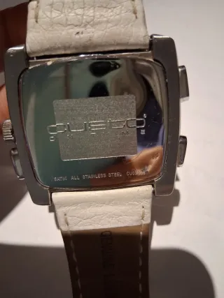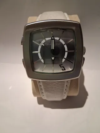 Elegante reloj Custo con diseño moderno. - Caja plateada de forma cuadrada. - Correa de piel blanca. - Esfera con detalles en blanco y negro.
