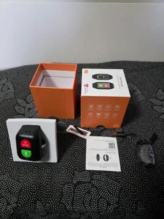 Dispositivo de seguridad y salud con funciones de emergencia. - Botón SOS rojo. - Botón de llamada verde. - Correa negra. - Incluye caja y manual.