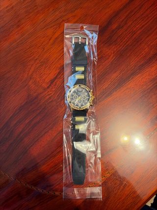 Reloj Swatch con cronógrafo de aluminio (muy ligero). Esfera negra. Correa de eslabones aluminio. Water resistant