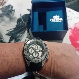 Reloj de pulsera Festina en muy buen estado. - Diseño deportivo y elegante. - Correa de caucho negra. - Bisel plateado con detalles.