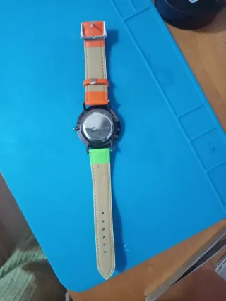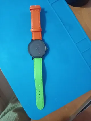 Reloj con un diseño moderno y llamativo, perfecto para añadir un toque de color a tu estilo. - Correa bicolor: naranja y verde lima. - Esfera redonda de color negro. - Diseño minimalista.