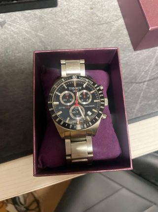 Reloj Tissot PRS 516 con cronógrafo y detalles en negro y plata. Un accesorio elegante y funcional. - Esfera negra con detalles plateados. - Correa de acero inoxidable. - Bisel con taquímetro. - Hay que cambiarle la pila PRECIO NEGOCIABLE (venta en persona=más barato)
