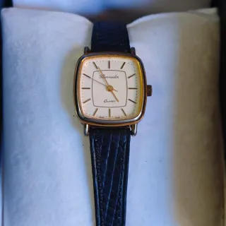 Elegante reloj de pulsera Thermidor para mujer, con un diseño clásico y sofisticado. Funciona bien y está en buen estado. Está hecho en Suiza. Incluye su caja original. - Caja y detalles en tono dorado. - Correa de piel en color negro. - Esfera clara con marcadores.