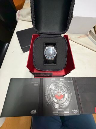 Reloj Oris Aquis Date con caja y correa en tonos azules y negros. Incluye su caja original y manual. Reloj de 2014 usado pero en perfecto estado. - Esfera azul. - Correa de caucho negra. - Bisel giratorio unidireccional. - Ventana de fecha.