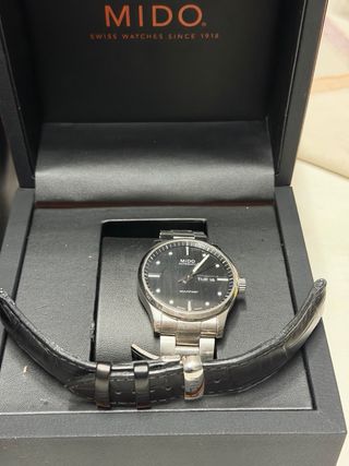 Reloj Mido Multifort con caja y correa en tonos negro y plateado. Presentado en su caja original. Año 2012 perfecto estado. - Diseño elegante y moderno. - Correa de metal y de piel. - Cierre desplegable.