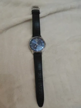 Elegante reloj de pulsera con correa de piel. - Esfera azul con detalles plateados. - Indicador de día de la semana y fecha.