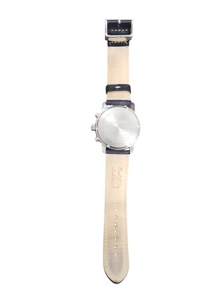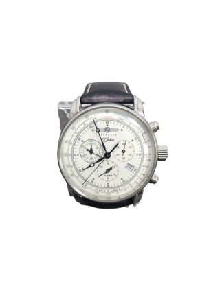 Reloj de pulsera Zeppelin con diseño clásico y esfera blanca. - Correa de piel negra. - Bisel plateado. - Indicadores de cronógrafo y alarma.