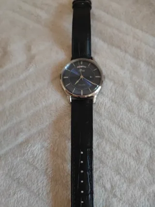 Modelo 1791641 Movimiento automático Grosor de la caja de 11,5 mm / Diámetro de la caja: 44 mm Esfera negra Correa de piel negra En su caja original con su tarjeta 3 ATM de resistencia al agua El agua del grifo o la lluvia no daña nuestros relojes siempre y cuando la caja, la corona y el cristal permanezcan intactos. Precio en la tienda : 220€