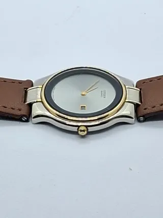 Elegante reloj Citizen con una combinación de colores oro y plata. - Diseño clásico y atemporal. - Correa de cuero marrón.