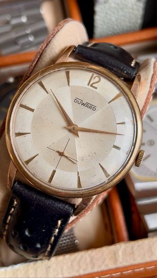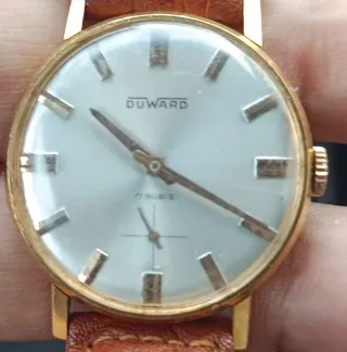 Reloj DUWARD original fabricado en Suiza en los años 50. Caja chapada en oro (10 micras). Calibre mecánico (de cuerda) AS1130 en buen estado de funcionamiento. Ideal para colección y uso diario. Fantástica esfera Guilloche con numerales en forma de flecha y marcadores en oro en relieve, todo en muy buen estado. Cristal plexi nuevo, caja chapada en oro. Las agujas chapadas en oro, con precioso segundero a las 6. Correa tipo rally a estrenar de 20mm. Diámetro 37,4mm sin incluir la corona Más relojes en mi perfil !!!! 👀 Envío certificado con numero de seguimiento de Correos. No se incluyen caja ni documentos. No se admiten devoluci
