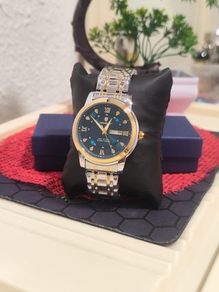 Reloj de diseño sofisticado y llamativo, perfecto para quienes buscan un accesorio con presencia. Cuenta con esfera verde con números romanos dorados, aportando un toque clásico y elegante. El bisel está decorado con piedras brillantes tipo diamante, que realzan su estilo premium. La correa metálica bicolor (plateado y dorado) con incrustaciones brillantes combina resistencia y diseño, ideal tanto para ocasiones especiales como para elevar un look diario. Incluye calendario con lupa, detalle práctico y distintivo.