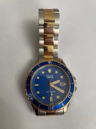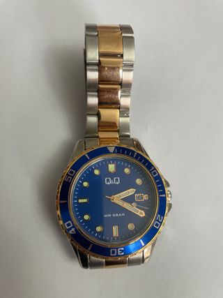 Reloj de pulsera con un diseño elegante y moderno. - Esfera de color azul. - Detalles en tono dorado. - Correa de eslabones combinando plata y oro.