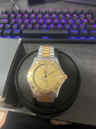 Reloj TAG Heuer Professional 2000 con una combinación de colores oro y plata. - Esfera dorada. - Bisel giratorio. - Correa de eslabones mixtos. - Corona firmada pero picada. - El fechador no funciona pero la hora si. - Pila recien cambiada. - Se entrega con la caja original.
