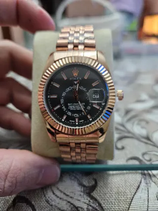 Reloj en oro rosa con esfera negra. Sin estrenar - Bisel estriado giratorio. - Indicador de fecha. - Correa de oro rosa. - Esfera negra con marcadores luminosos.