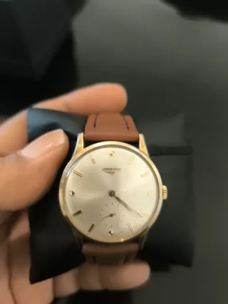 Elegante reloj Longines Vintax de los años 50, con una estética clásica y atemporal. - Caja dorada. - Correa de piel marrón.