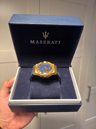Elegante reloj de la marca Maserati, con una combinación de colores azul y dorado. Coleccion Potenza Cuarzo, acero y PVD oro. Correa de cuero. Poco uso.