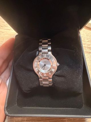 Elegante reloj de la marca Cartier con un diseño bicolor. - Combinación de oro y plata en la caja y la correa. - Esfera con números romanos.
