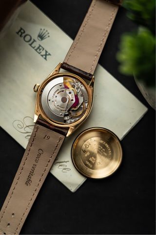 Rolex Oyster Perpetual oro 18kt. Referencia 1005. Tamaño de 34mm, calibre automático 1570 recién revisado. Caja completa de oro 18kt. Buen estado general, correa de piel genérica, hebilla Rolex chapada. Reloj y papel Rolex.