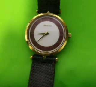 Reloj Gucci modelo 2000M, vintage, con movimiento suizo de cuarzo. Su diseño combina detalles dorados y un bisel con números romanos en tono burdeos, sobre una esfera blanca. - Batería instalada - Correa original de piel color burdeos con textura. - Caja dorada, chapada oro - Cierre de hebilla.