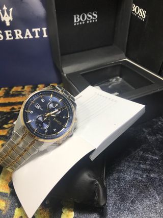 Elegante reloj para hombre de la marca Boss. - Combinación de colores oro y plata en la correa y la caja. - Esfera azul con detalles dorados. - Indicador de fecha.