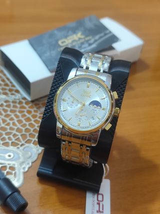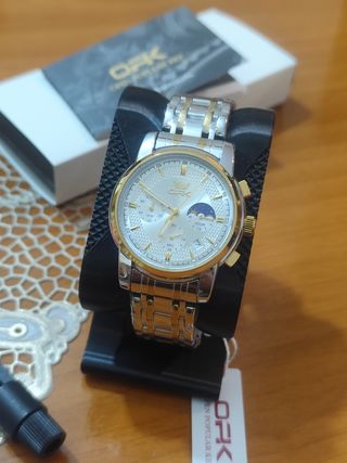 Elegante reloj para hombre con un diseño sofisticado que combina tonos dorados y plateados. - Esfera con detalles texturizados. - Indicadores de hora, minutos y segundos. - Función de fase lunar. - Correa de eslabones metálicos.