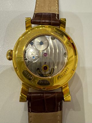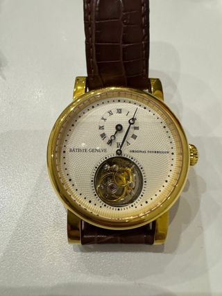 Elegante reloj Batiste Geneve con movimiento Tourbillon. - Caja y detalles en oro. - Correa de piel marrón. - Esfera con números romanos y detalles texturizados. Edicion limitada a 2997 unidades . Entrega en mano en madrid . Envio a toda españa
