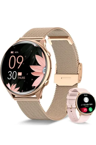 Elegante reloj inteligente con un diseño moderno y atractivo. Perfecto para complementar tu estilo diario. - Correa de malla metálica dorada. - Correa adicional de silicona rosa. - Pantalla táctil a color.