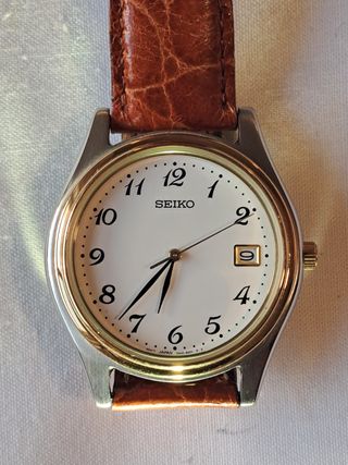 Este elegante Seiko Slim Vintage de los 90 combina la distinción del oro y la plata con una correa de cuero marrón, creando un accesorio clásico y versátil. Su esfera blanca con números arábigos y ventana de fecha ofrece una lectura limpia y sofisticada. Edición Especial: Luce la inscripción "DOMECQ" en la tapa trasera, un detalle exclusivo de la famosa bodega. Precisión Japonesa: Equipado con el fiable y delgado calibre 7N42. Un reloj con historia y en excelente estado, ideal para quien busca calidad y exclusividad.