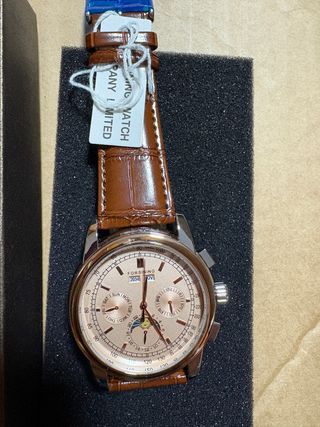 Reloj de pulsera Thomas Earnshaw con caja original. - Esfera verde y dorada. - Correa de cuero negra. - Cierre de hebilla. - Mecanismo automático con 29 joyas. - Ventana de fecha.