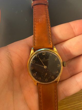 Elegante reloj Breitling Geneve con esfera negra y detalles dorados. - Caja y detalles en oro (chapado de 20 micras). - Correa de cuero marrón. - Esfera negra con marcadores horarios - 33 mm - Todo original , funcionando, precio negociable.