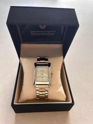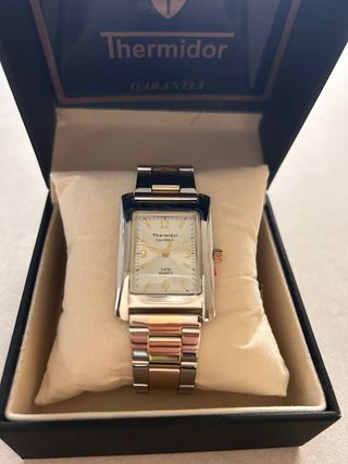 Elegante reloj de pulsera Thermidor con un diseño clásico y sofisticado. - Combinación de tonos dorados y plateados. - Caja rectangular. - Correa de eslabones.
